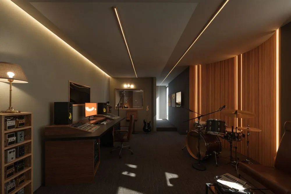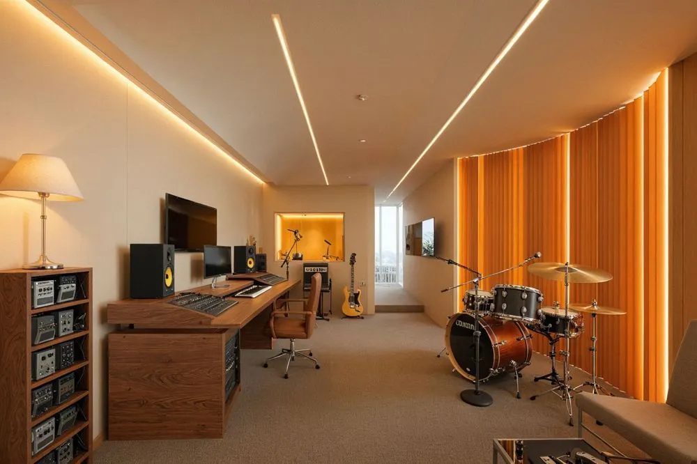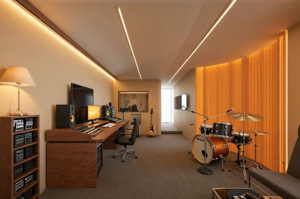 a recording studio with instruments and sound equipment