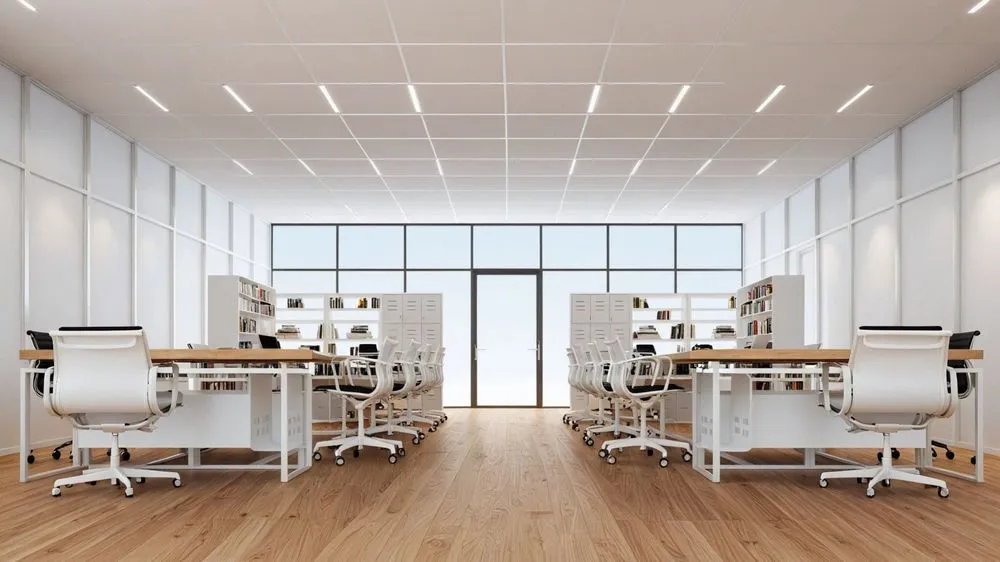 an office with white walls and gray flooring