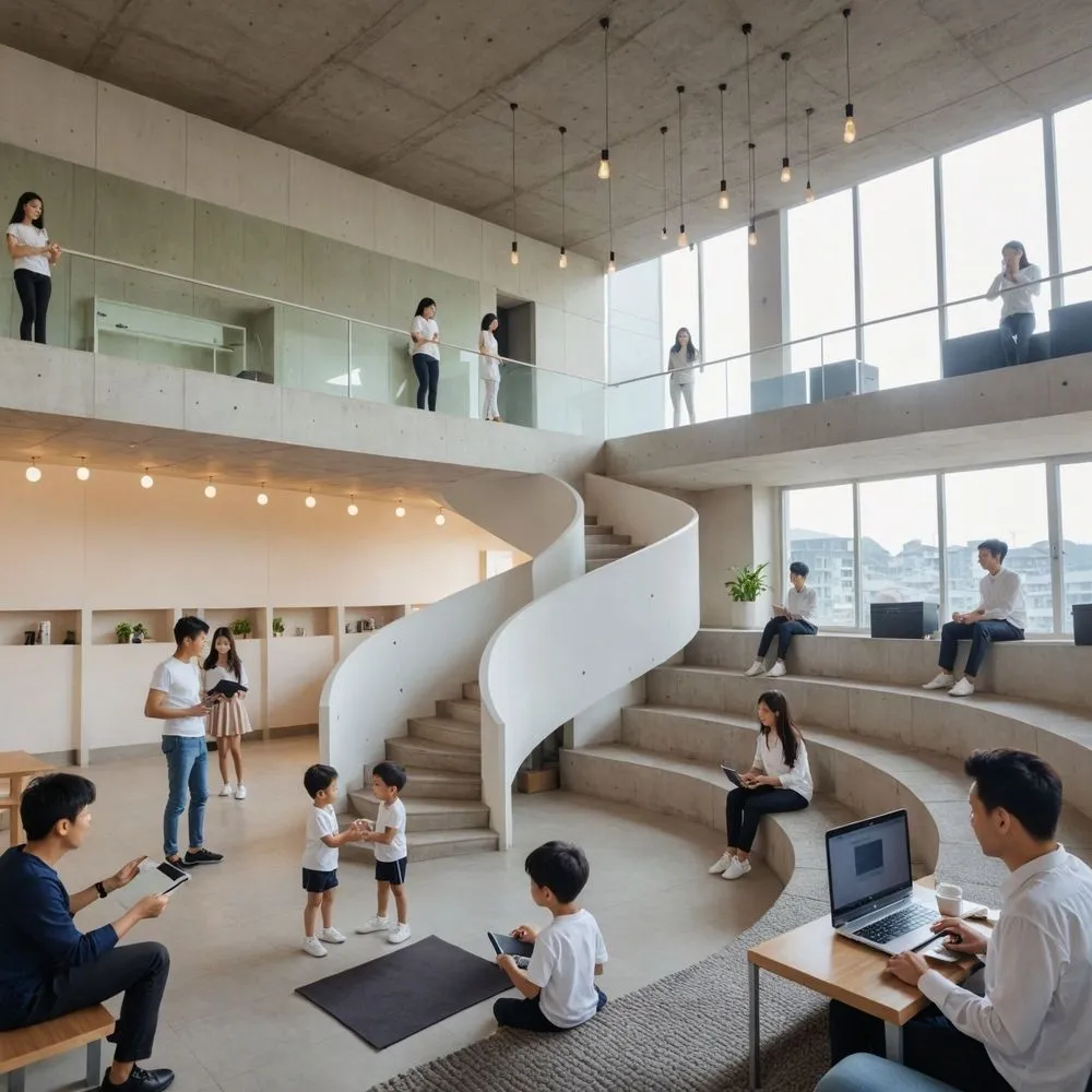 people are sitting in chairs and standing on a staircase