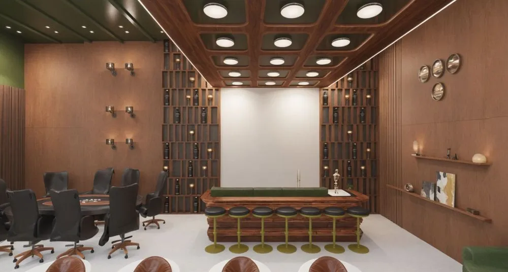 a conference area with leather chairs, desk and tv