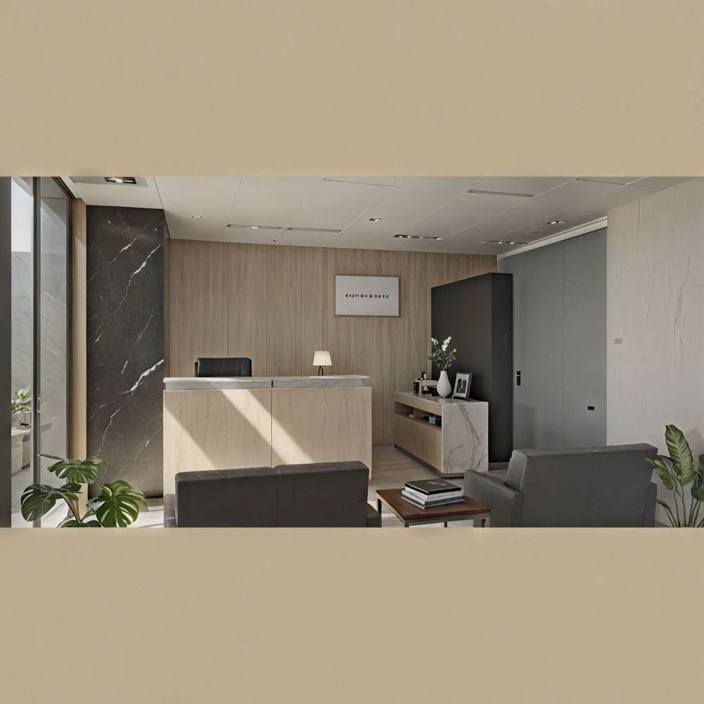 the interior of a modern office with a marble counter