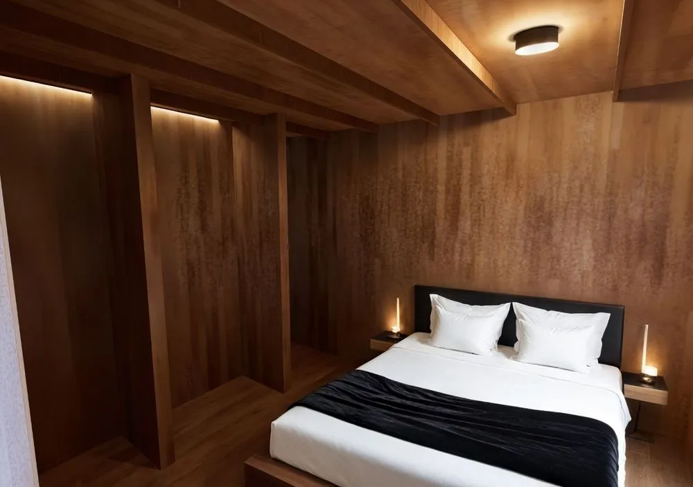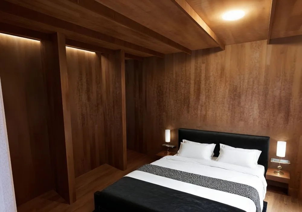 a bed with two lamps above it and a wooden wall