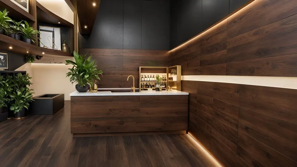 an elegant kitchen decorated in dark and dark wood