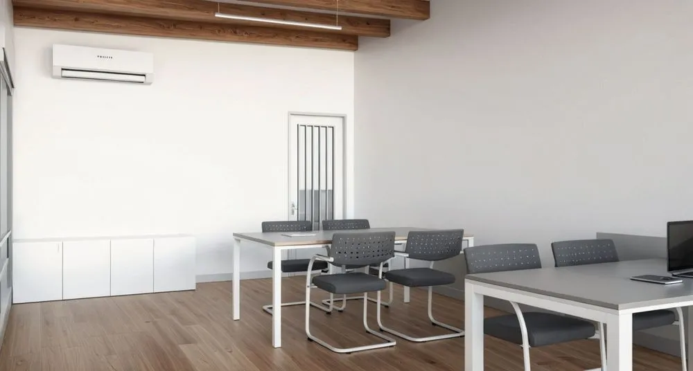 an office with white walls and gray flooring