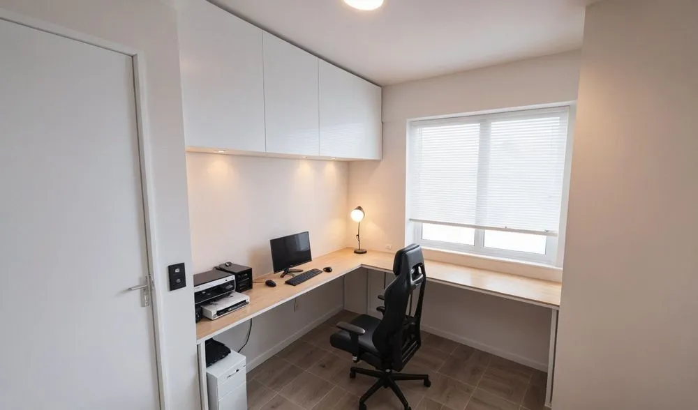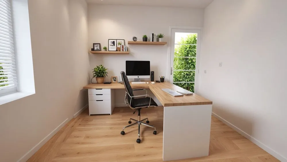 a white office with a large work desk