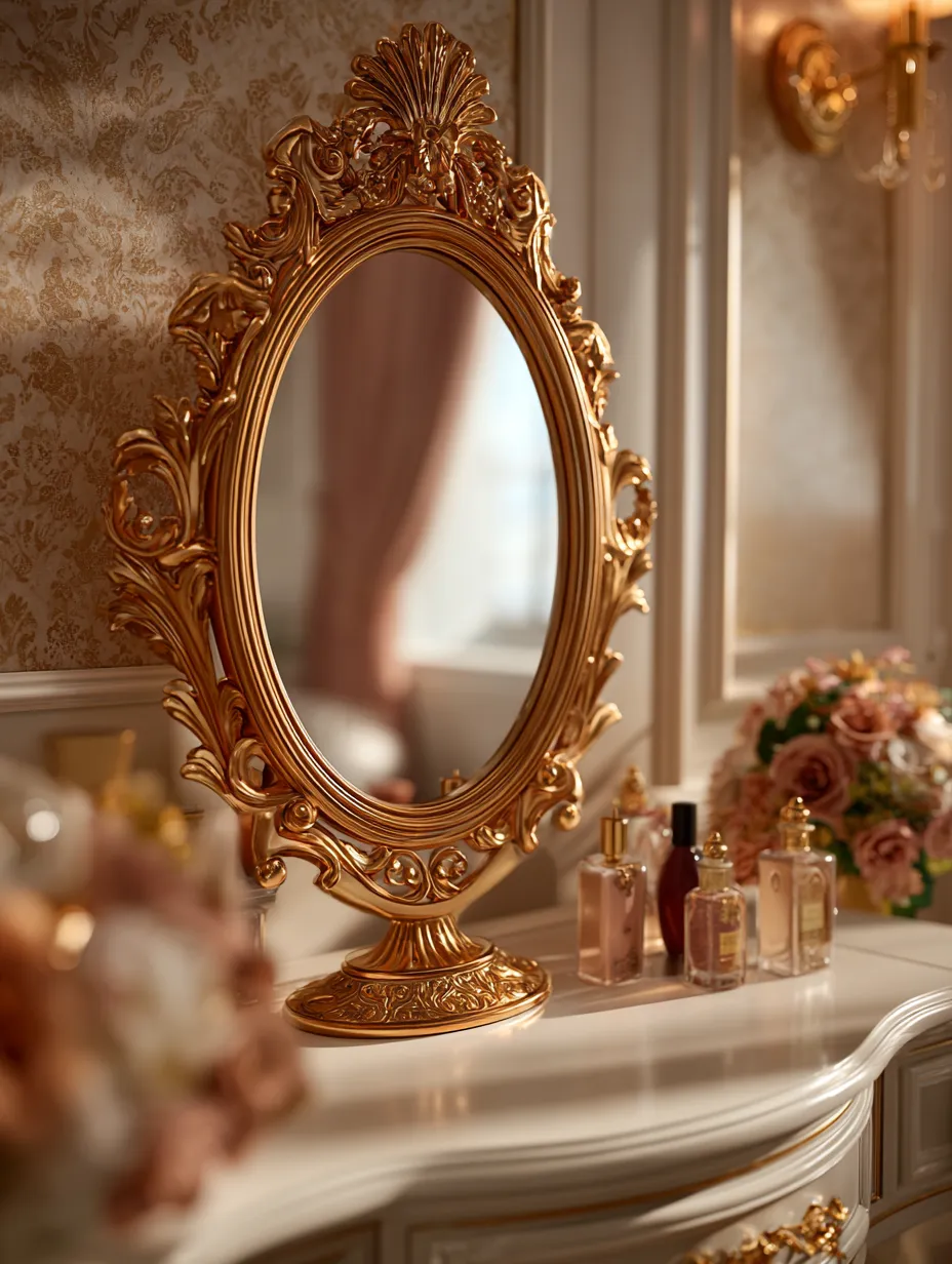 An ornate framed mirror above your vanity can transform your daily routine into a luxurious experience. It adds personality and can be the crowning jewel of your dressing area or bathroom. 🖼️