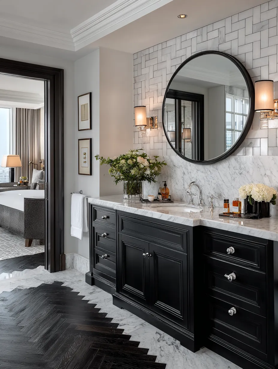 Elevate your daily routine with a touch of Art Deco in your bathroom! This is where functionality meets pure elegance. Think bold geometric tiles, often in black and white, creating a striking contrast. Polished metals like chrome or brass are essential for fixtures, faucets, and vanity hardware, adding that essential gleam. A statement vanity with clean lines and perhaps a marble top will be a focal point. Don't forget a decorative mirror with a metallic frame. Soft, diffused lighting enhances the luxurious feel. It’s about creating a chic, spa-like sanctuary. What’s your favorite bathroom tile pattern? 🖤 #BathroomIdeas#ArtDecoIdeas#HomeBathroomIdeas#DecorBathroomIdeas#InteriorBathroomIdeas#ArtDecoBathroom#GlamBathroom#GeometricTiles#ChromeFixtures#LuxuryBathroom