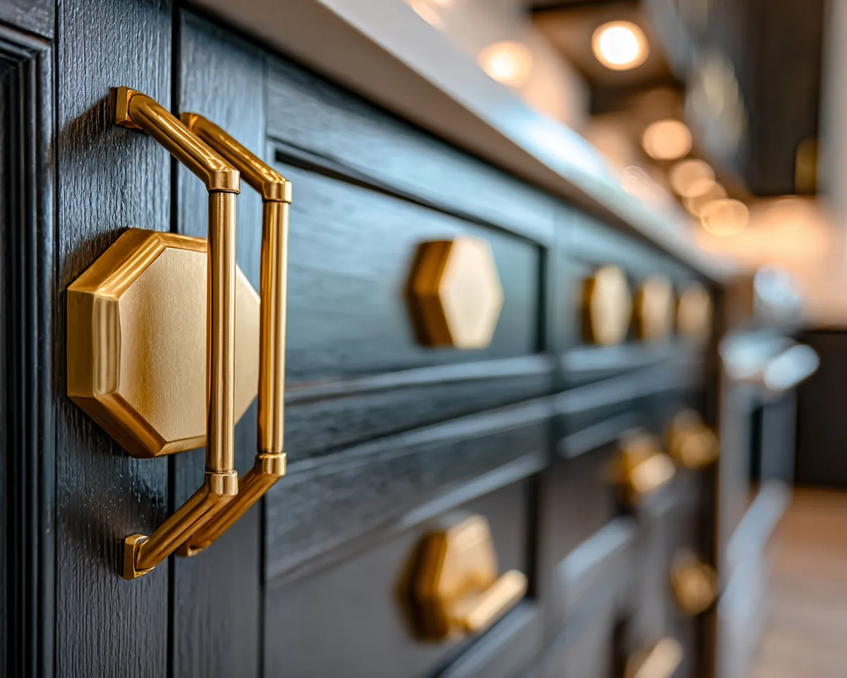 * **Cabinet Pulls & Knobs:** Opt for minimalist geometric shapes like cubes, octagons, or angular bars in a brushed or polished gold finish.