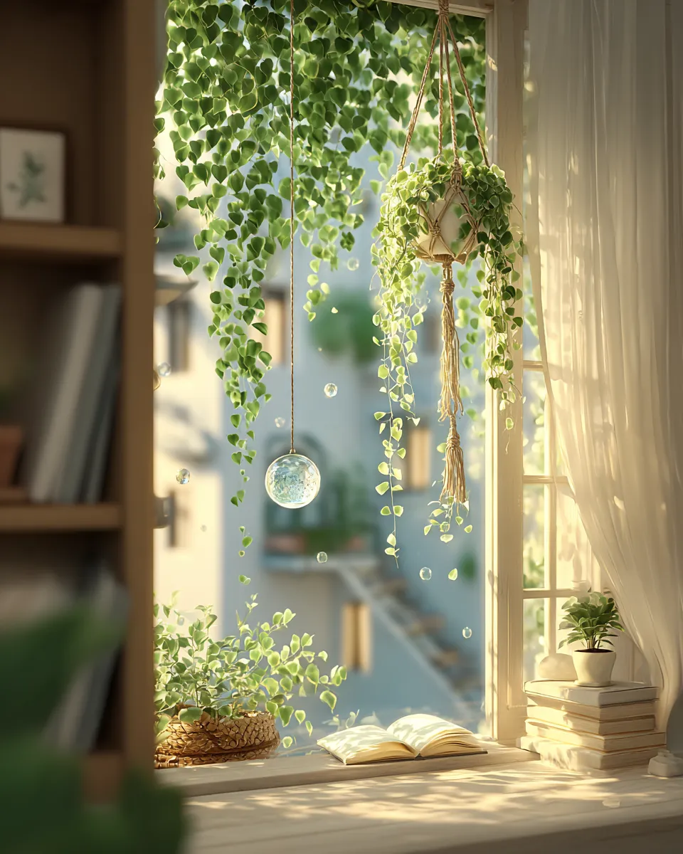 Take your plant game to new heights – literally! Hanging plants are a game-changer for urban living, adding lushness without sacrificing floor space. 🪴 Think trailing Pothos cascading from ceiling hooks, delicate String of Pearls draped over shelves, or vibrant air plants suspended in minimalist holders.