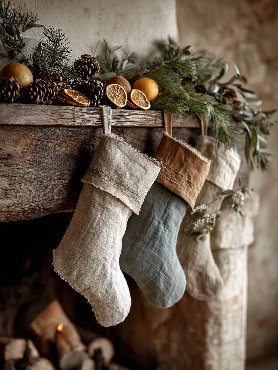 These natural stockings bring a touch of organic charm that complements a relaxed, sophisticated holiday aesthetic.