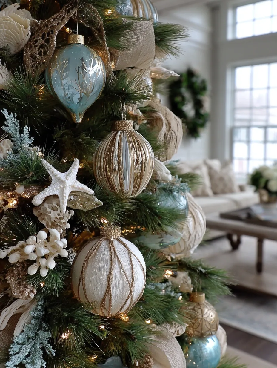 * **Natural Ornamentation:** Delicate glass baubles with a pearlescent finish, hand-blown glass pieces resembling sea glass, and maybe even a few elegant starfish or shell ornaments.