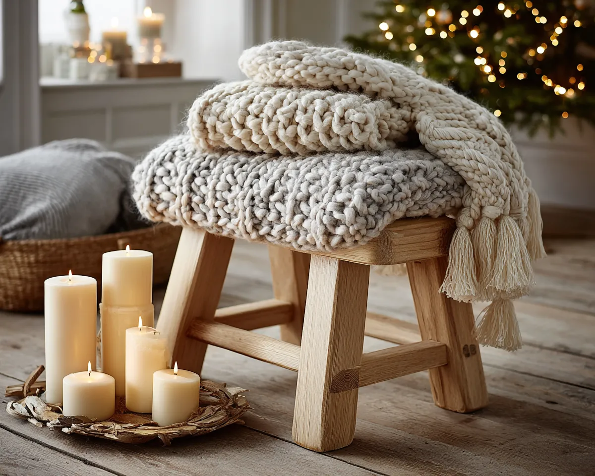 Start with a beautiful wooden stool or small side table. Layer in texture with a chunky knit throw in a neutral tone and a few soft linen cushions.