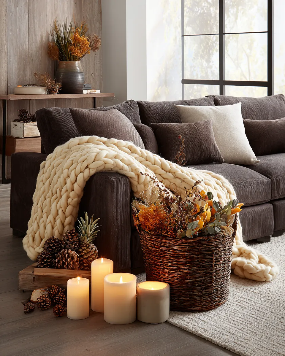 🌟 **Embrace Natural Elements:** Woven baskets, chunky knit throws, pinecones, and dried orange slices instantly add organic texture.