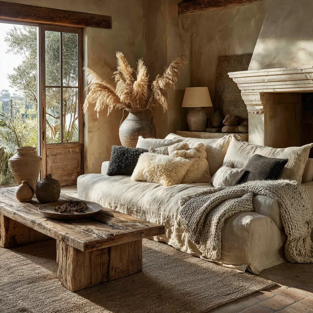* **Stone & Ceramic Details:** A rough-hewn stone fireplace or handmade ceramic vases bring an earthy groundedness.