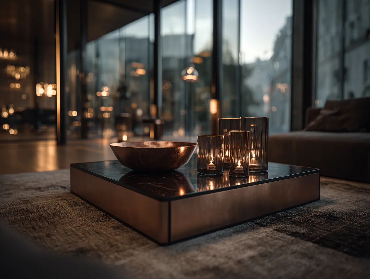 * **Statement Pieces:** A coffee table or side table with a copper frame or detailing.