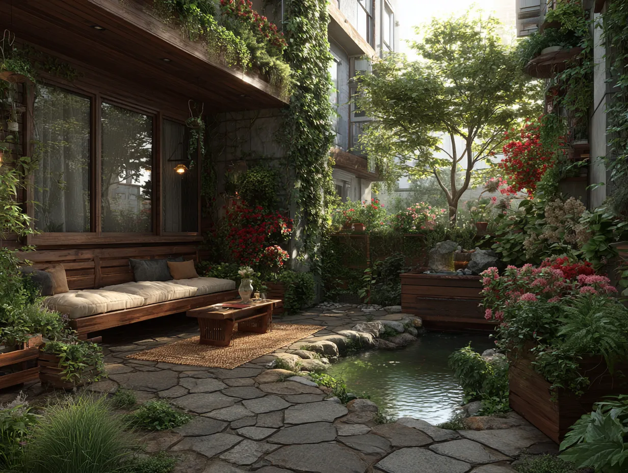 🪵 Natural Materials: Use stone paving, wooden decking, and rustic furniture.