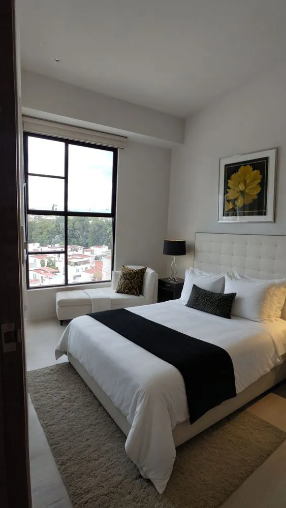 the bedroom has a bed, dresser, chair and picture frames on the wall