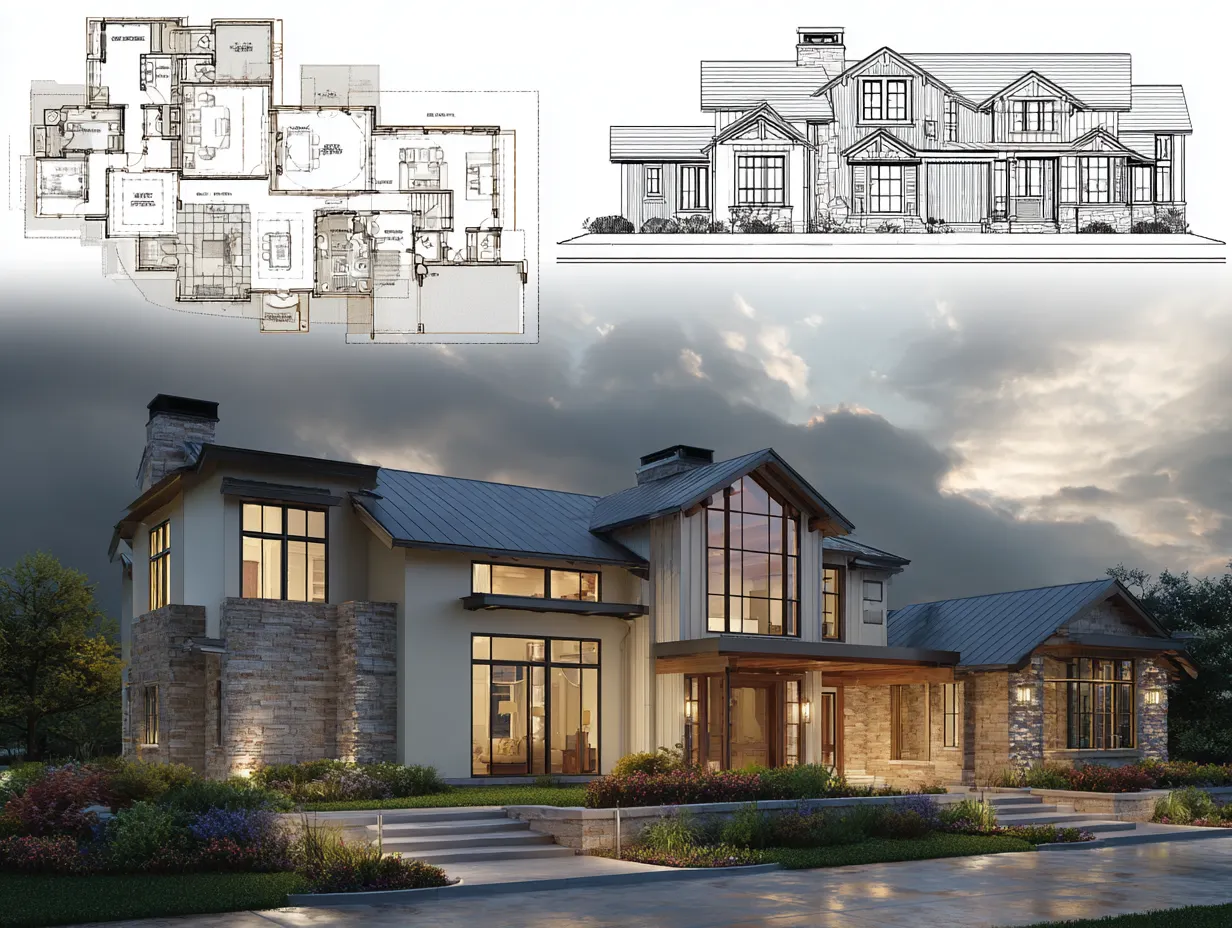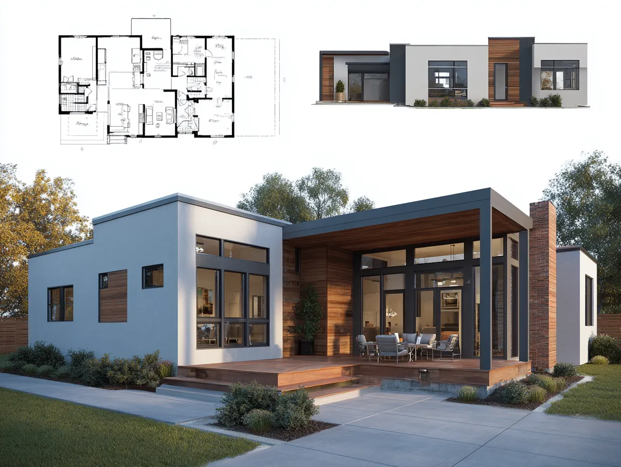 En minutos, reciba su paquete completo de planos de casa—planos de planta, elevaciones y renderizados 3D—listo para guardar y compartir.