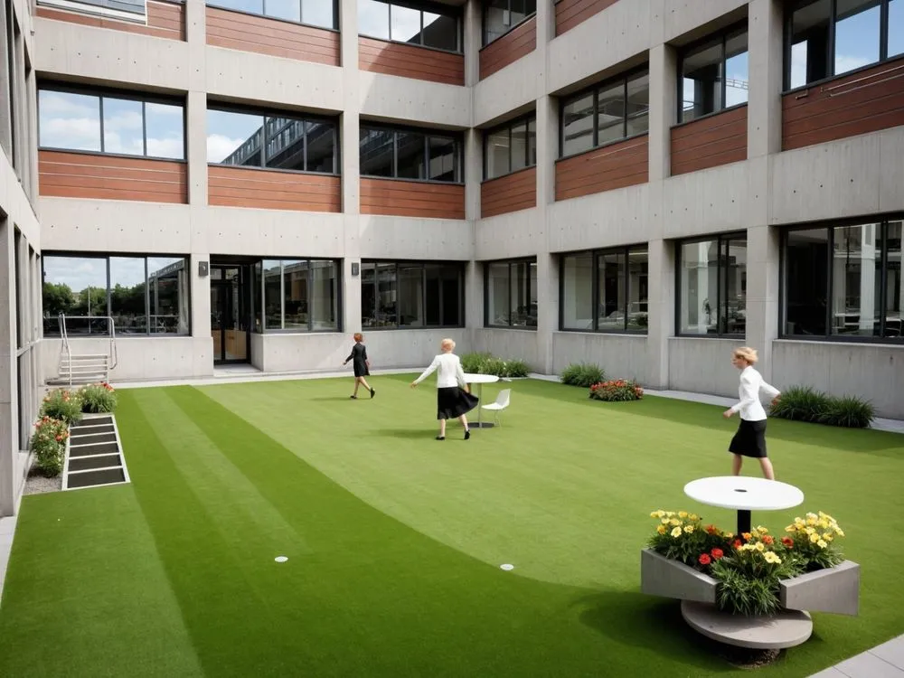 three young people play frisbee in the courtyard of an office building