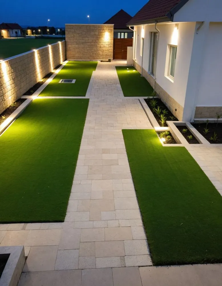 a large backyard with green grass and lights the ambience is super.