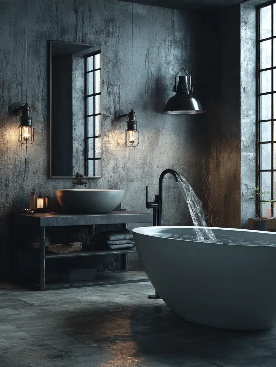 Transform your bathroom into an Industrial Luxe sanctuary! ⚙️ Focus on raw materials that evoke a spa-like yet edgy feel. Think exposed concrete or natural stone tiles for the walls and floors. Matte black or brushed nickel fixtures – from the faucet to the showerhead – are essential. Incorporate elements like an open metal vanity or shelving units that expose the structure. A freestanding bathtub with clean lines can be a showstopper. Consider industrial-inspired lighting, like metal sconces, to add warmth. It's about creating a space that feels both grounded and remarkably chic. ✨ Save this for your dream bathroom! #IndustrialBathroomIdeas#ConcreteBathroomIdeas#StoneTileIdeas#MatteBlackFixturesIdeas#MetalVanityIdeas#BathroomDesign#HomeSpa#InteriorInspo#RenovationGoals#LuxuryBathroom