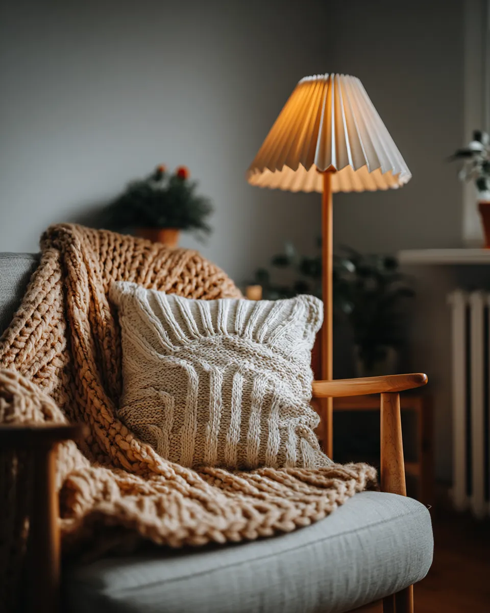 • **Soft Textiles:** A cozy knit throw and linen cushion.