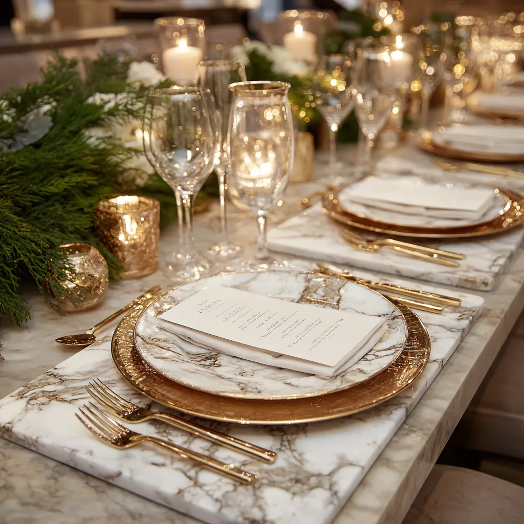 Want to create a holiday tablescape that will WOW your guests? My secret lies in the perfect pairing of luxurious marble and gleaming gold accents! 🌟 We're talking about marble placemats or a stunning marble centerpiece that instantly elevates your setting. Add gold-rimmed chargers, golden cutlery, or subtle gold candle holders to capture the festive spirit. This combination brings a sophisticated, almost regal feel to your Christmas dinner, making every meal feel extra special. 🤍 It’s a beautiful blend of natural texture and metallic shine. Save this for your next holiday hosting inspo! #MarbleTableIdeas#GoldAndMarbleChristmas#DesignerTableSettings#ChristmasTablescapeIdeas#LuxuryHolidayDecor#MarbleCenterpiece#FestiveDining#ElegantHoliday#HomeDecorInspo#ChristmasDining