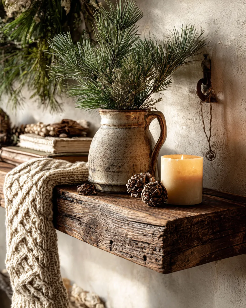 * **Functional Accents:** Use utilitarian items like wooden crates for gift storage or simple ceramic pitchers for festive greenery.