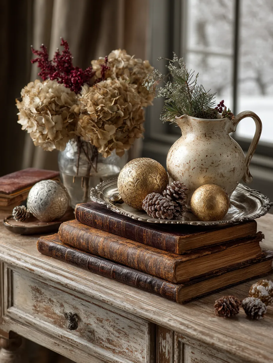 Capture the romantic essence of French chateau living this Christmas with enchanting vignette styling. โœจ It's all about curated collections that whisper tales of elegance and heritage. Imagine a distressed wooden console table adorned with a stack of antique books, topped with a vintage silver tray holding gilded ornaments and a small, overflowing ceramic pitcher of mistletoe. ๐ŸŒฟ Incorporate touches of aged patina and natural textures. This holiday decor style is about creating small, intimate scenes that evoke nostalgia and charm. Perfect for adding that extra sparkle to your festive French country home! Save for your holiday styling inspiration. ๐Ÿ’– #FrenchChateauIdeas #ChristmasVignetteIdeas #RomanticDecorIdeas #HolidayStylingIdeas #AntiqueDecorIdeas #FrenchCountryChristmas #CuratedCollections #HolidayCharm #NostalgicDecor #ChateauLiving