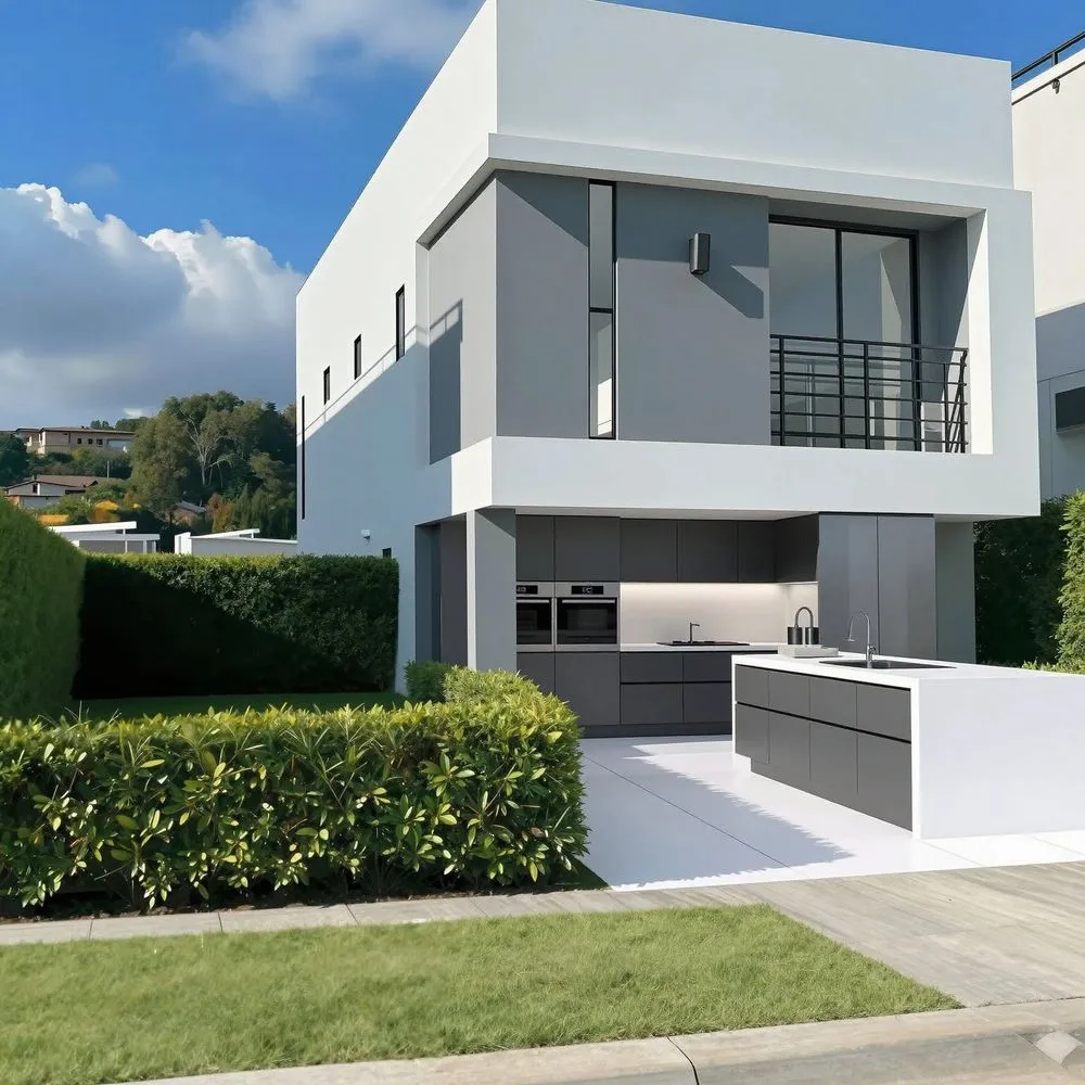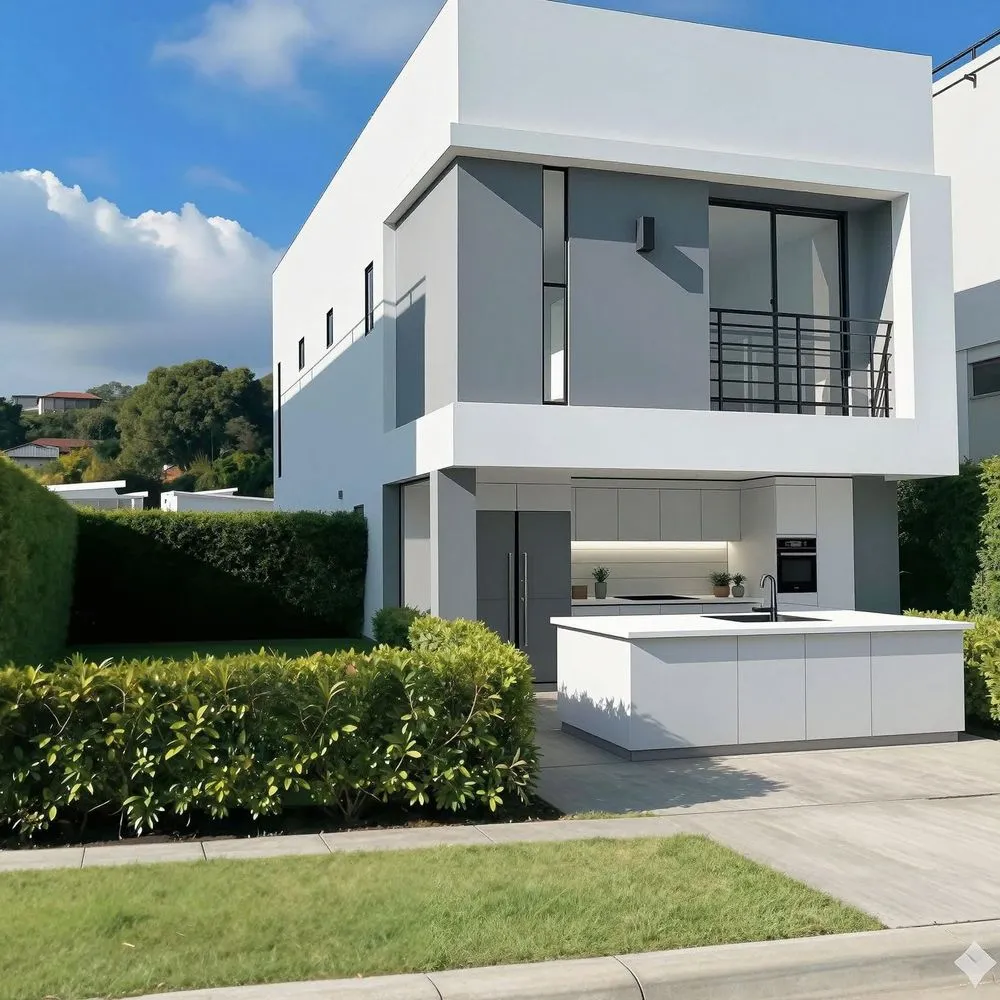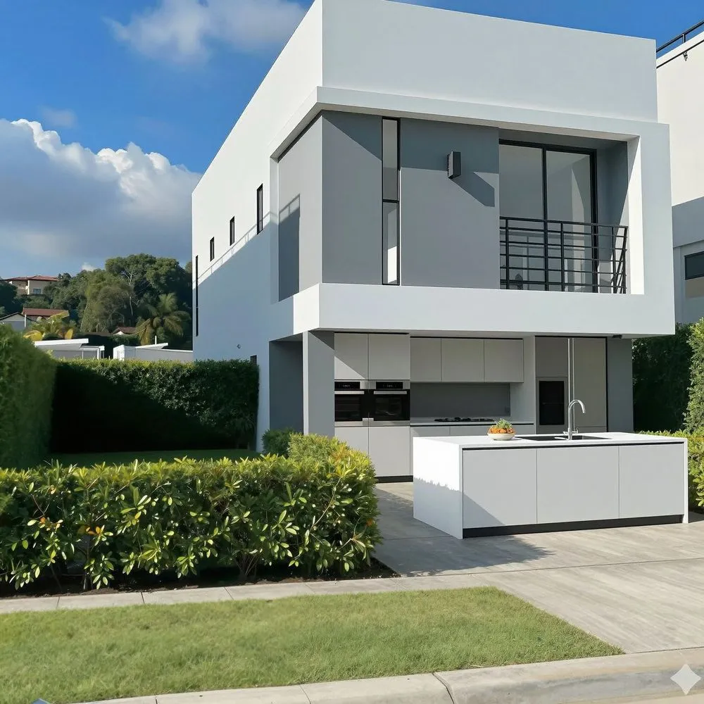 the patio, stairway and stairs to the upper floor are situated near a large swimming pool