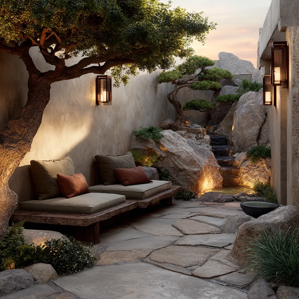 * **Zen Water Features:** A small, simple water basin or a trickling fountain.