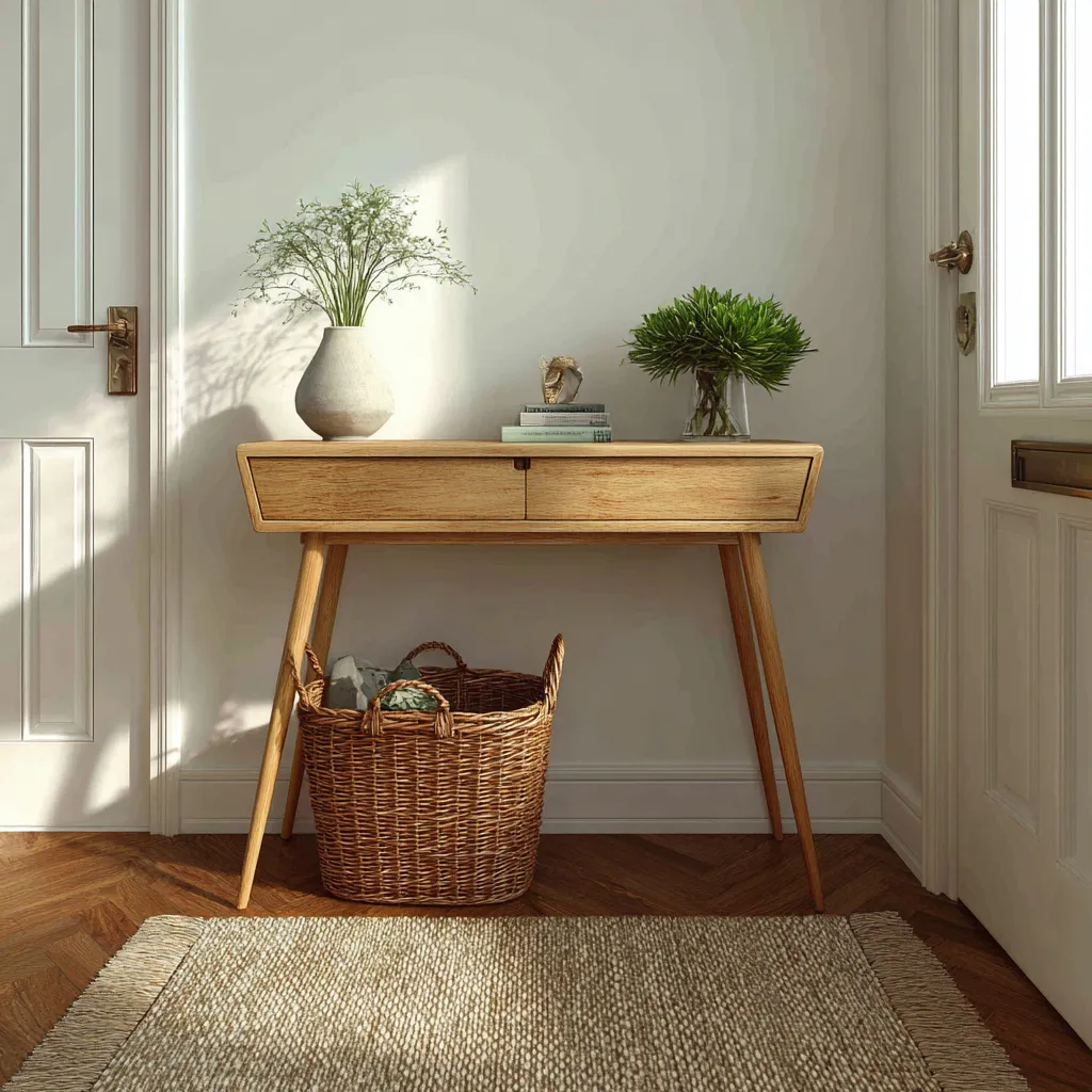 * **Wood tones are key:** Opt for a wooden console table or bench.