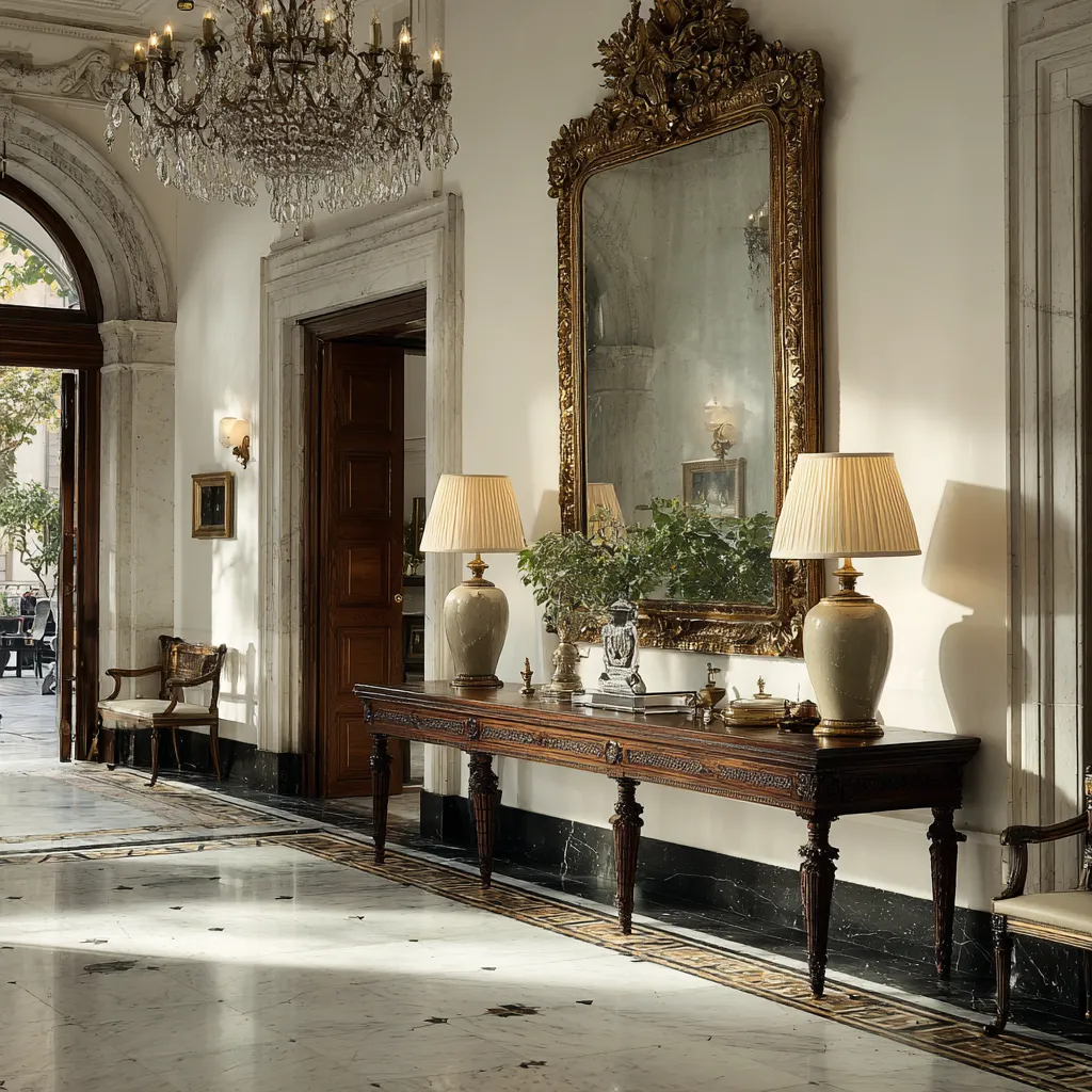 Unlock the enduring beauty of a Neo-classical foyer! 🏛️ Aim for symmetry and impeccable proportions. Think a grand console table topped with antique silver, balanced by two elegant table lamps. A large, ornate mirror will reflect light and enhance the sense of space. Consider a statement chandelier casting a warm glow. White marble flooring or a subtle patterned rug grounds the space beautifully.