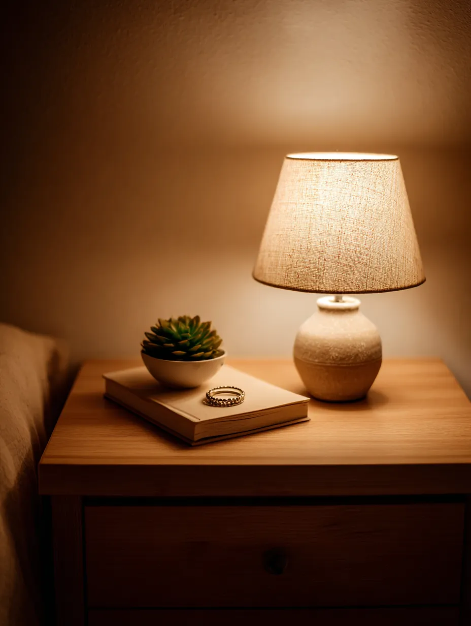 * **Minimalist Nightstand:** Natural wood or a simple white surface.
