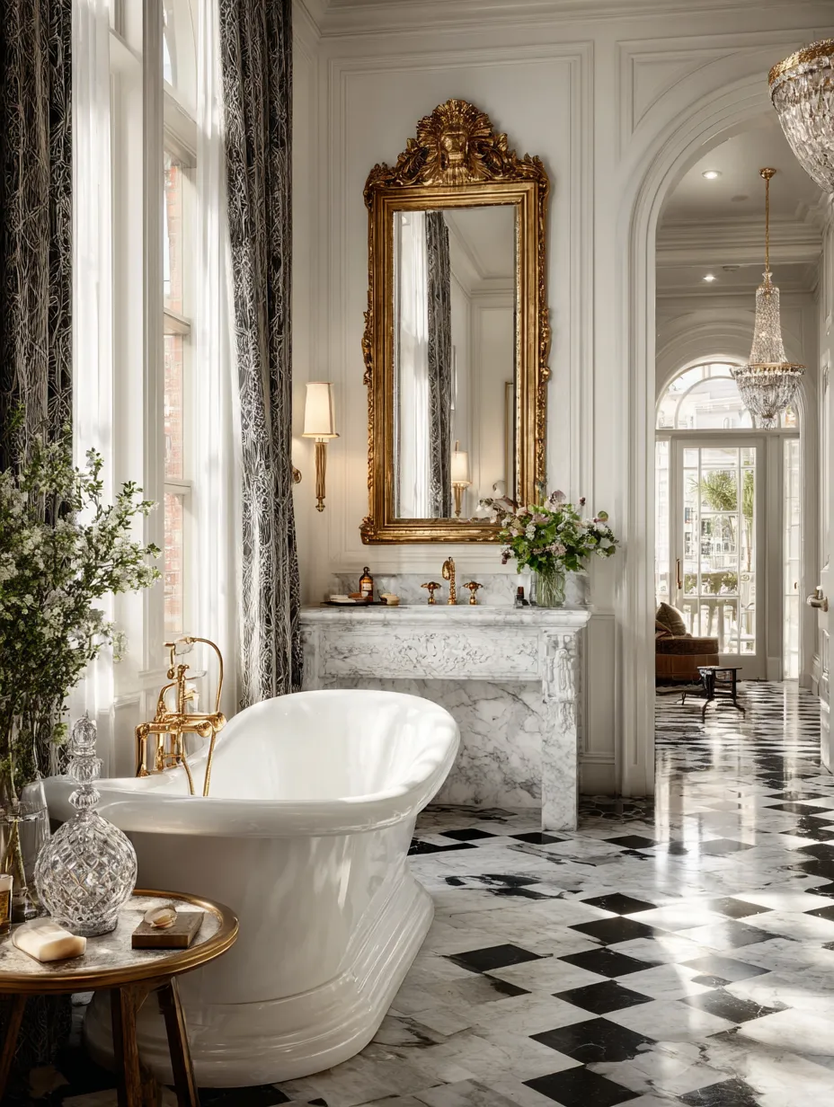 Bring the opulence of a French chateau into your bathroom! It's all about luxurious materials and timeless antique accents. Start with classic fixtures – a freestanding clawfoot tub is a dream, paired with brass or nickel taps.