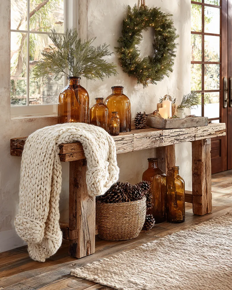 Rustic Radiance: Cozy Christmas Entryway with Weathered Wood & Amber Tones 🌲