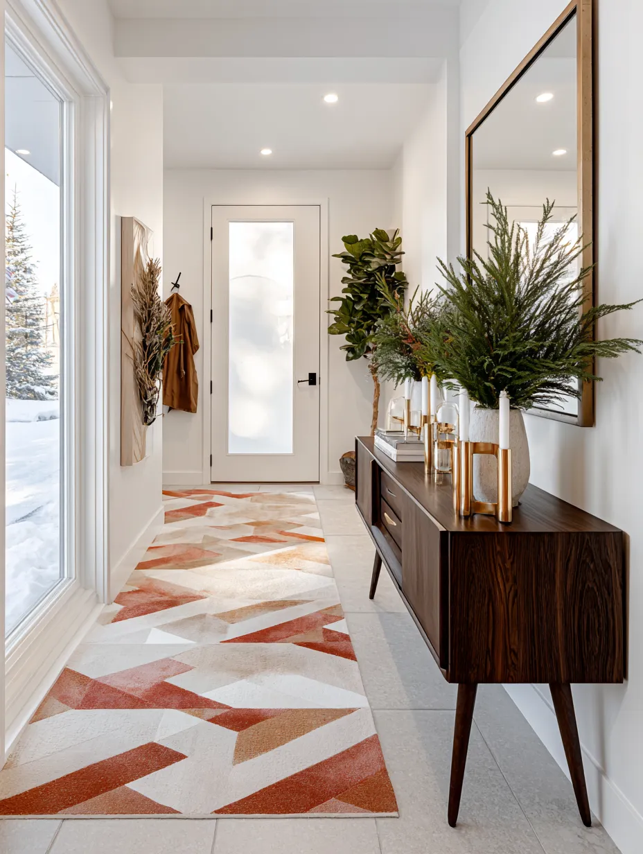 Don't forget a stylish rug to welcome guests. Think abstract geometric patterns or classic motifs in muted holiday hues. It’s all about creating a warm, inviting, and impeccably styled welcome. ✨ #MCMEntrywayIdeas#HolidayEntryway#MidCenturyModernHome#EntrywayDecor#ChristmasWelcome#StylishEntryway#MCMDecorIdeas#HomeEntrance#FestiveDecor#MinimalistChristmas