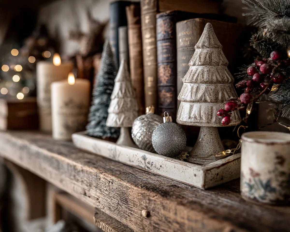 * **Shelf Styling:** Cluster candles, small ornaments, and seasonal books on shelves.