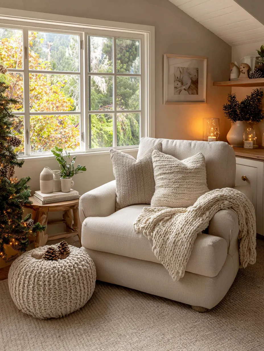 * **Earthy Neutrals:** Swap bright reds for muted creams, soft grays, and warm browns. Think linen stockings and woolen throws.