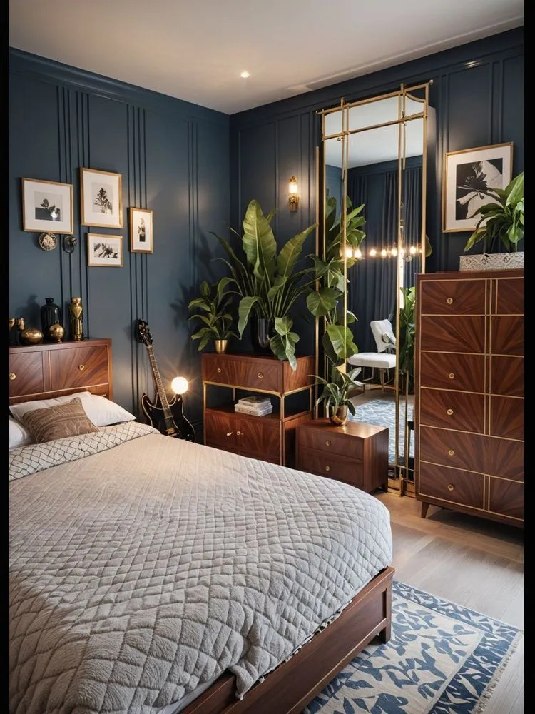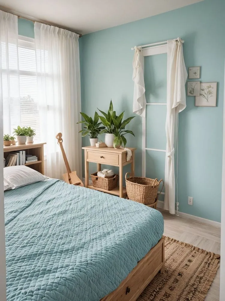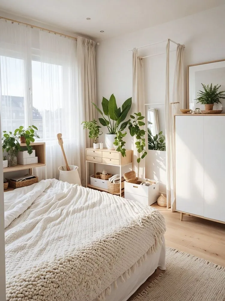 a bedroom that has a bed with a blanket on it and some plant pots on top of the bedspread