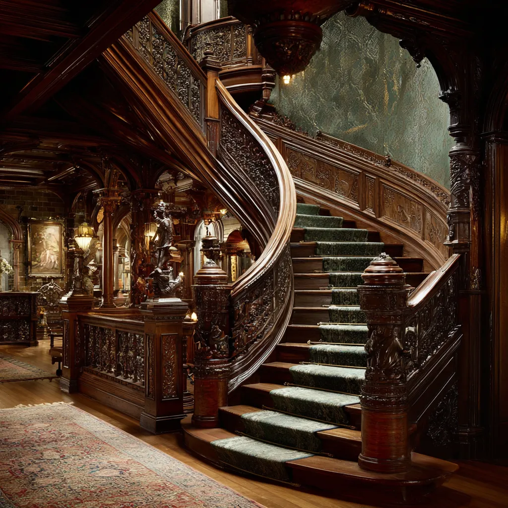 Your staircase is more than a passage; it's a statement piece in a Gilded Age home. Imagine sweeping, curved banisters crafted from dark, polished hardwoods like mahogany or oak, often featuring intricate carvings and spindles. 👑 Wrought iron or gilded metal railings add a touch of decorative artistry. Grand newel posts, perhaps topped with sculpted figures or ornate finials, anchor the design. Period-appropriate wallpaper on the walls and a stunning runner can complete the look, transforming your ascent into an experience.