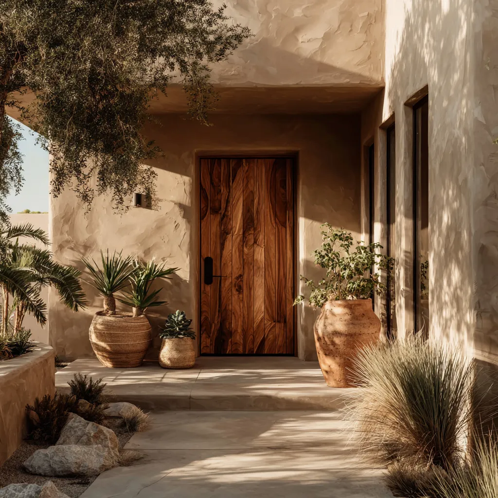 Your front door and immediate entryway are the first tactile experience of your desert-inspired home. Opt for natural materials like wood with visible grain or textured plaster. Colors should be earthy – warm browns, muted terracotta, or sandy beiges. Simple, elegant hardware in matte black or brushed bronze adds a refined touch. Surround the entrance with low-maintenance desert plants to enhance the connection to nature.
