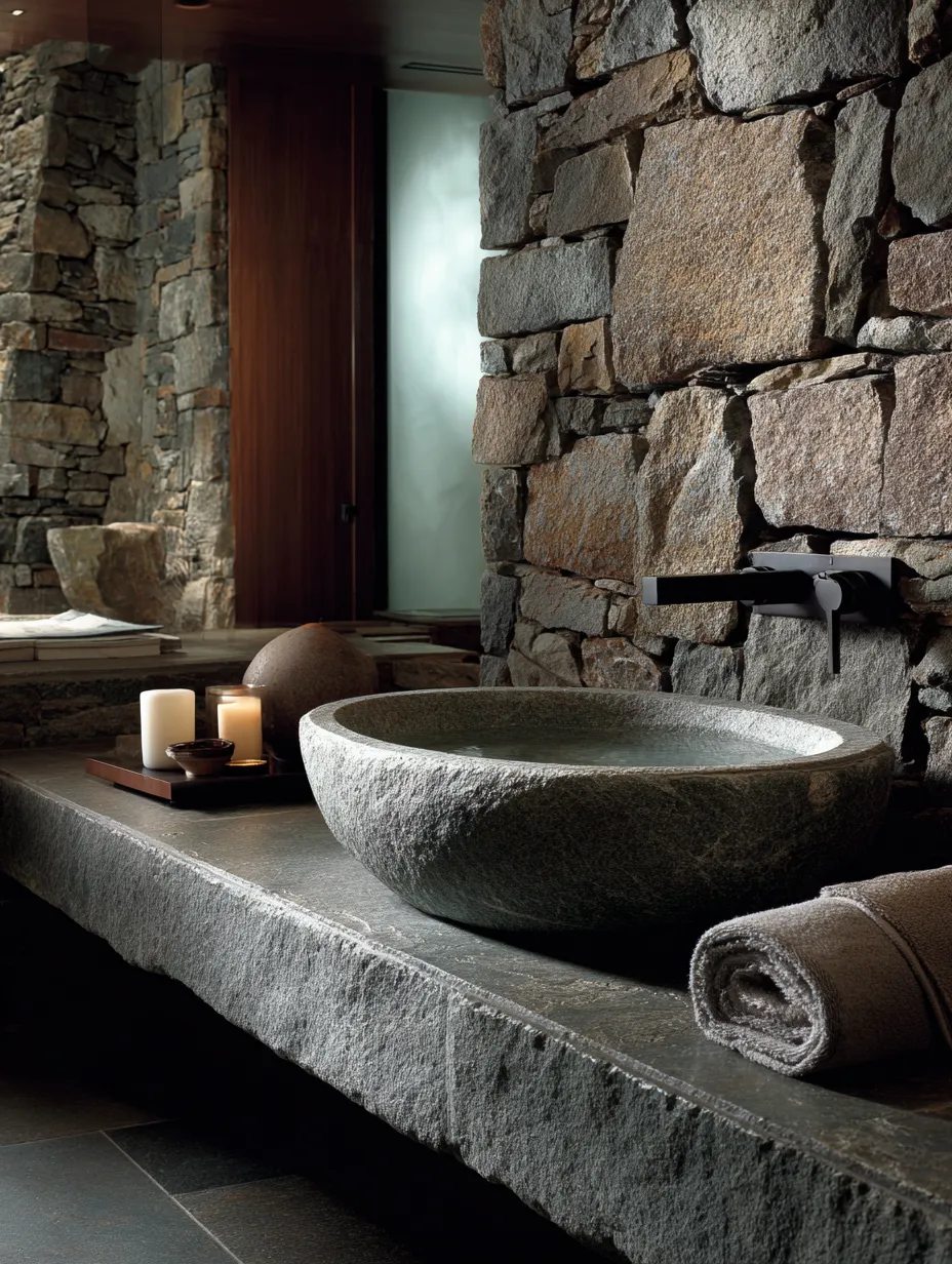 - **Earthy Tones:** Complement the stone with muted greens, greys, and warm beige accents.