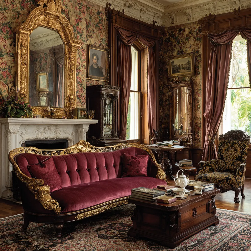 Step into a Gilded Age parlor, where every detail whispers of refined luxury and social gatherings. Embrace a palette of deep reds, burgundies, and ornate gold accents. Key elements include plush velvet upholstery, intricate floral patterns on wallpaper and textiles, and heavily carved dark wood furniture. Accessorize with delicate porcelain figurines, ornate gilded mirrors, and statement drapery.