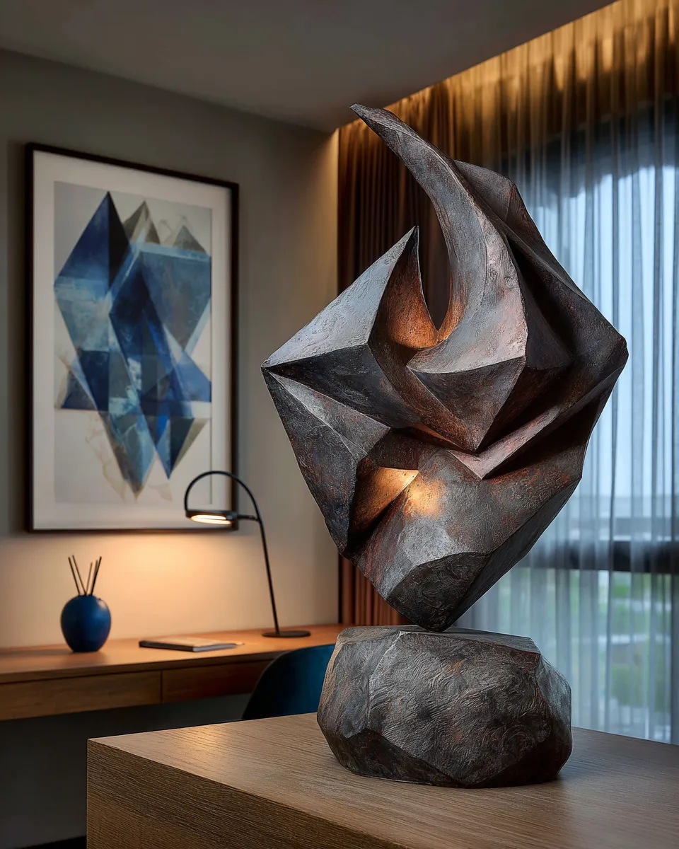 Create a study space that is as inspiring as it is functional, blending artistic expression with focused productivity. Save this for your dream study area! 💡 #StudyNookIdeas#AbstractDecor#BlueHome#ArtisticWorkspace#HomeOfficeDesign#DesignInspiration#SculpturalDesk#ModernStudy#CreativeSpace#HomeStyling
