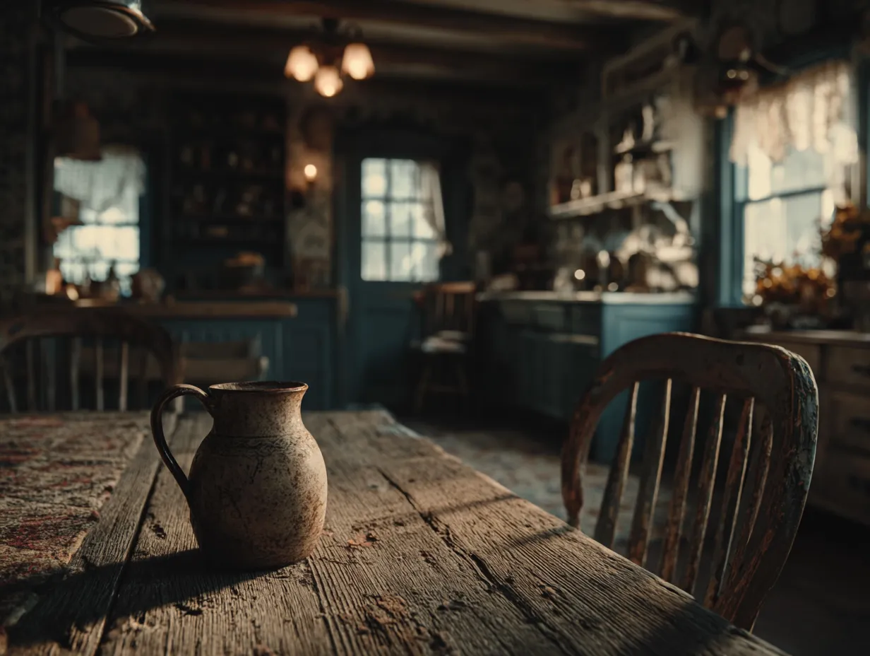 * **Furniture:** Tables, chairs, or cabinets with subtly worn edges and paint chipping.