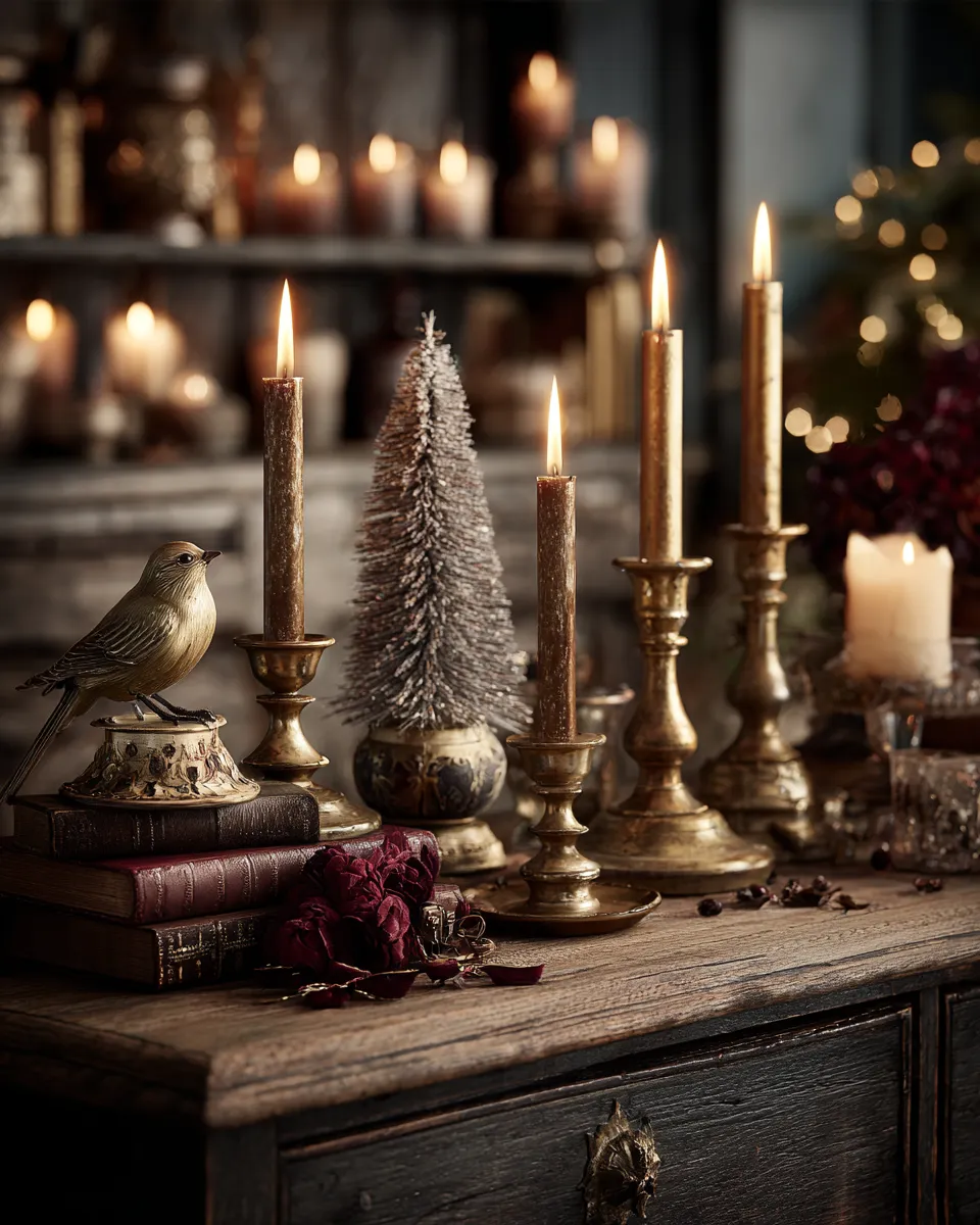 Vintage Noel: Aged Books & Warm Metals for a Subtle Christmas Mantel ✨📚