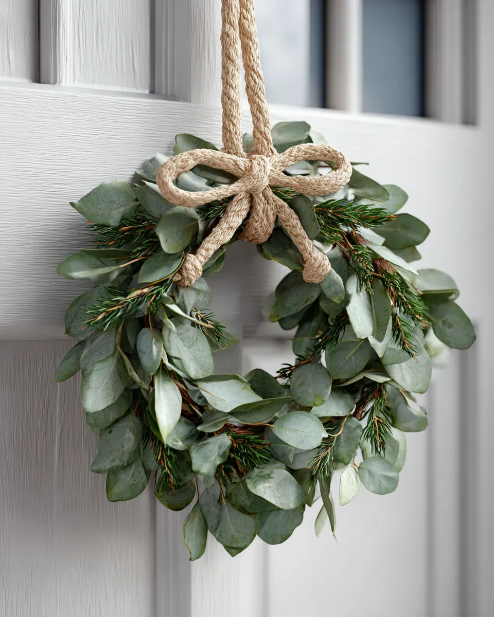 * **Eucalyptus & Pine Wreath:** A simple, natural wreath featuring lush eucalyptus and delicate pine sprigs, perhaps with a single twine bow.