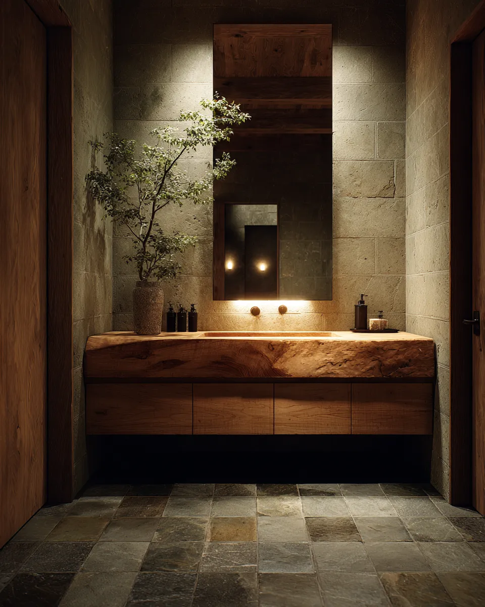 Create a PNW-inspired bathroom sanctuary that blends natural wood and stone for ultimate serenity. It's about bringing the calming elements of the outdoors into your daily routine. 🪵🌿
