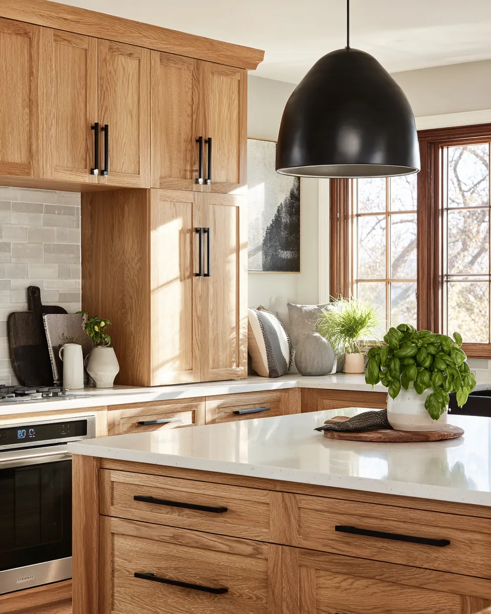 - **Natural Wood Cabinetry:** Light-toned woods like oak or ash with flat-front doors.